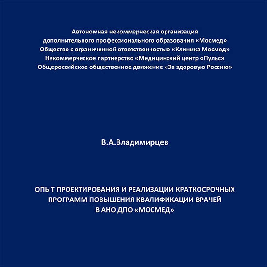 Вышла в свет монография ректора АНО ДПО «Мосмед» проф. В.А.Владимирцева «Опыт проектирования и реализации краткосрочных программ повышения квалификации врачей в АНО ДПО «Мосмед», в которой представлены итоги работы за 2015-2018 гг. учебно-клинического комплекса группы инновационных медицинских компаний «Мосмед» по интеграции лечебно-реабилитационной деятельности с повышением квалификации врачей по программам дополнительного профессионального образования в новой системе НМО.