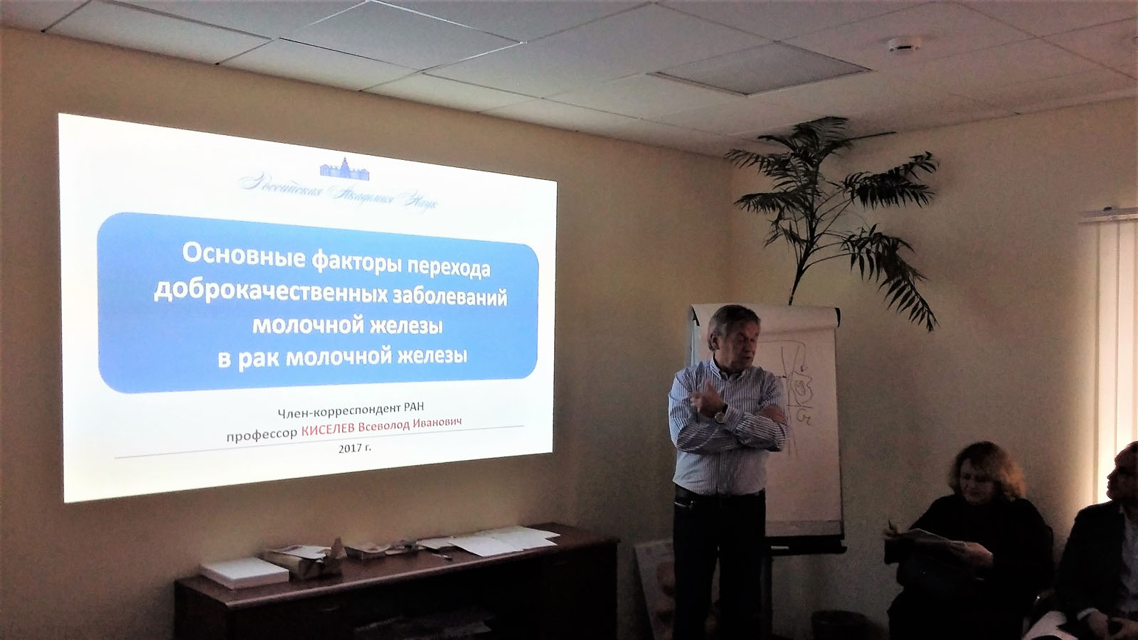 Лекции по новой концепции профилактической онкомаммологии, с особым акцентом на молекулярные основы и пусковые механизмы онкогенеза в женских репродуктивных органах, прочитали академик РАН, д.м.н., профессор Л.А.Ашрафян и член-корр. РАН, д.б.н., профессор В.И.Киселев (ФГУ «Российский научный центр рентгенорадиологии»), раскрывшие слушателям новые достижения экспериментальной и клинической онкологии в области патогенеза основных этапов канцерогенеза в молочных железах: этапе трансформации (превращение нормальных клеток в опухолевые, наследственно передающееся последующим популяциям клеток); этапе неконтролируемого размножения трансформированных клеток и этапе прогрессии (индивидуальное развитие опухоли путем устойчивых необратимых качественных и количественных изменений одного или нескольких признаков). Слушатели были ознакомлены с новой стратегией предупреждения онкологических заболеваний молочной железы, основанной на переориентации усилий в клинической онкомаммологии на доклиническую и раннюю клиническую стадии злокачественного процесса с целью ранней диагностики и своевременной фармакологической коррекции рака молочной железы.
