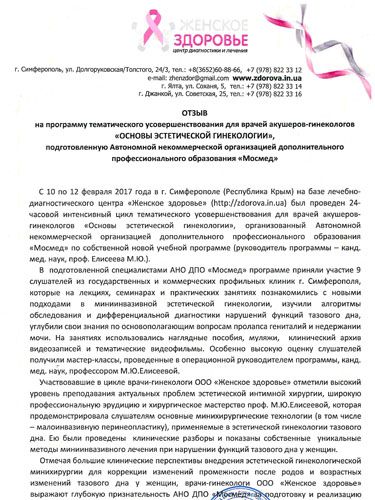 В ректорат АНО ДПО «Мосмед» поступили положительные отзывы на программу «Основы эстетической гинекологии», которые направили главный врач ООО «Гармония Мед» (г. Симферополь) М.Е.Захарова и директор ООО «Женское здоровье» (г. Симферополь) Т.М.Алябышева.