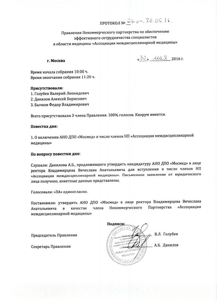 В соответствии с постановлением правления Некоммерческого партнерства по обеспечению эффективного сотрудничества специалистов в области медицины «Ассоциация междисциплинарной медицины», Автономная некоммерческая организация дополнительного профессионального образования «Мосмед» утверждена в качестве члена Некоммерческого Партнерства «Асссоциация междисциплинарной медицины» (протокол № Б/н от 30 мая 2016 г.).