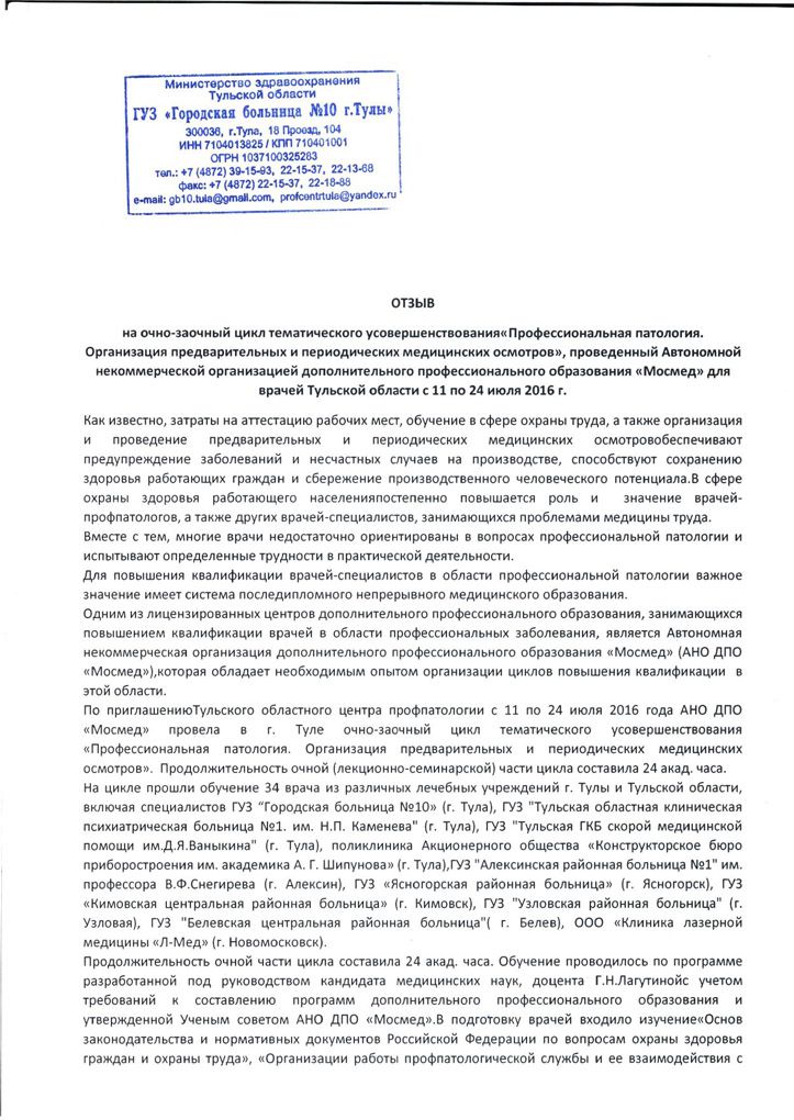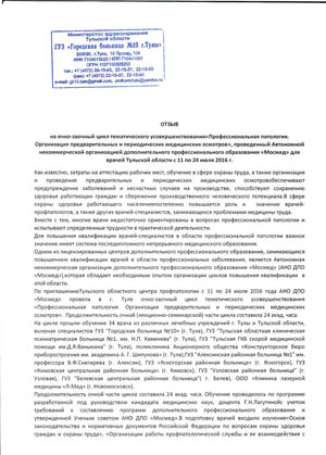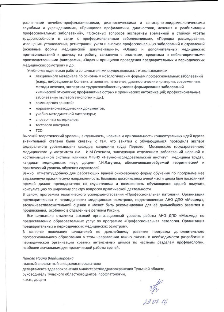 В ректорат Автономной некоммерческой организации дополнительного профессионального образования «Мосмед» поступил отзыв главного внештатного специалиста-профпатолога департамента здравоохранения Министерства здравоохранения Тульской области канд. мед. наук, доцента Пановой И.В. с положительной оценкой качества цикла тематического усовершенствования «Профессиональные заболевания. Проведение предварительных и периодических медицинских осмотров», проведенного для врачей Тульской области одним из ведущих экспертов в области медицины труда, доцентом Лагутиной И.В.