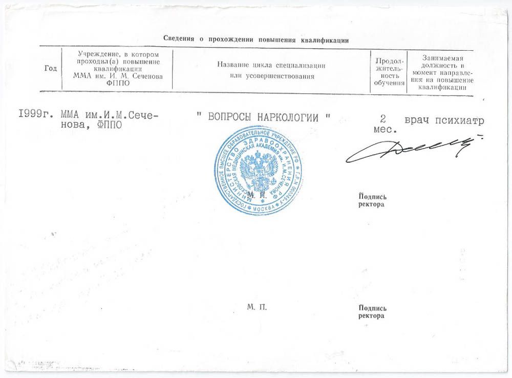 - 1999 г. – «Вопросы наркологии» ММА им. И.М. Сеченова, ФППО