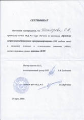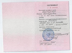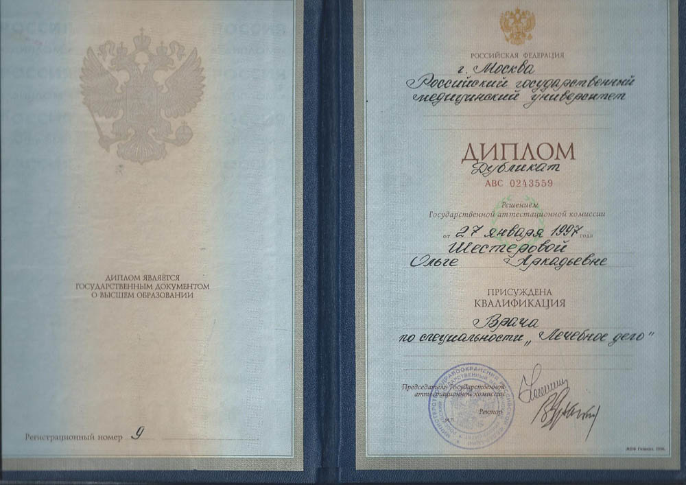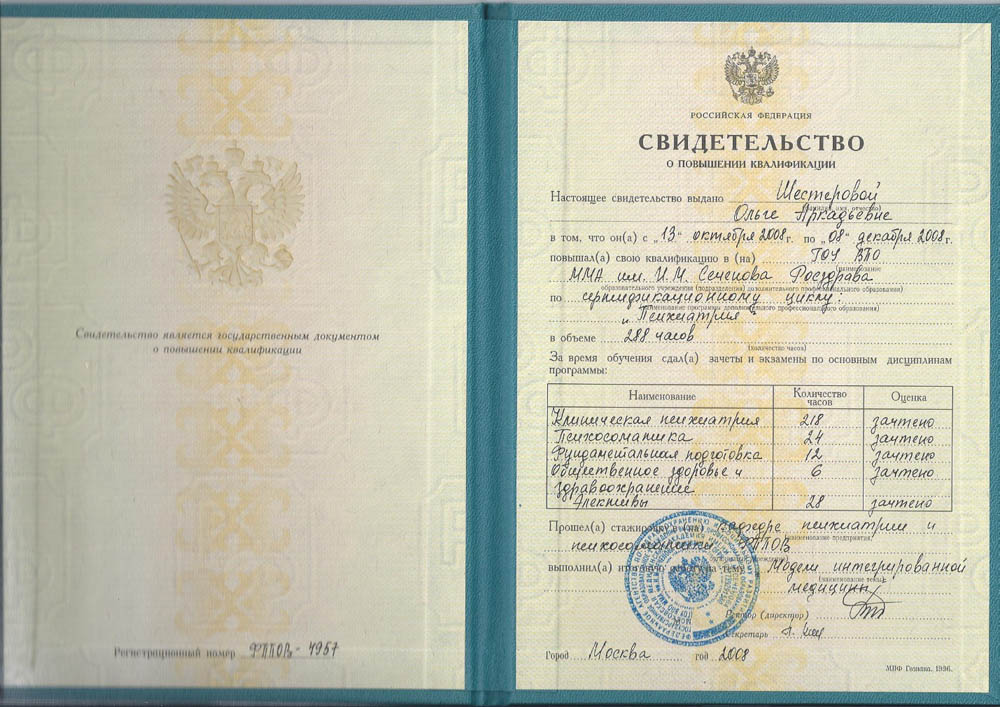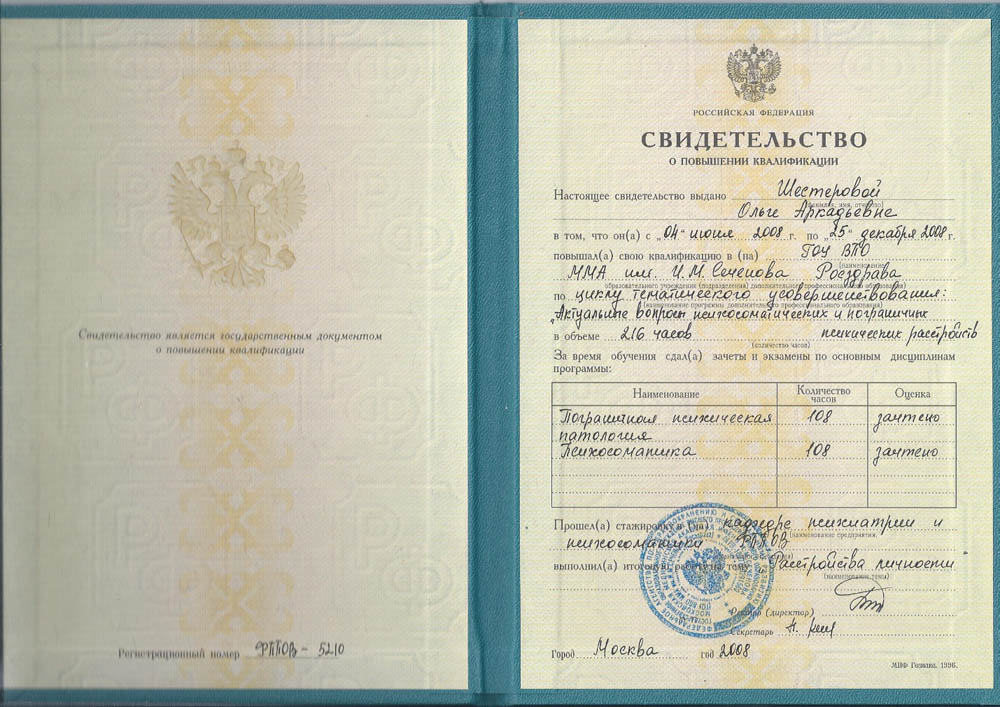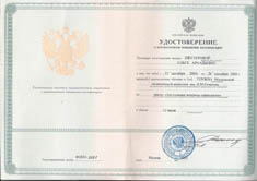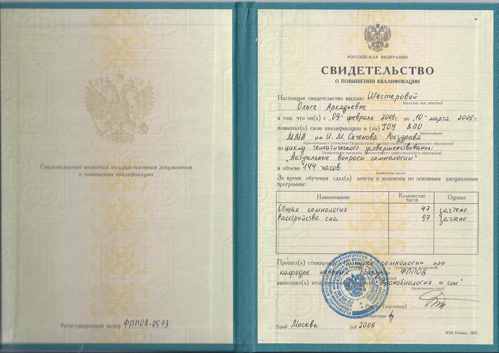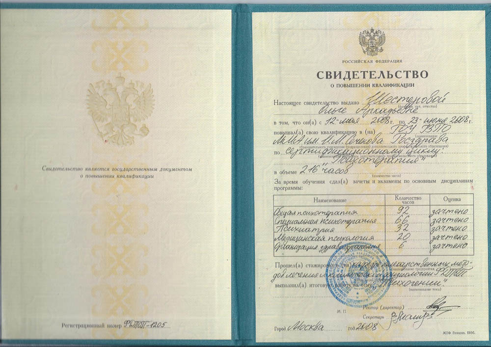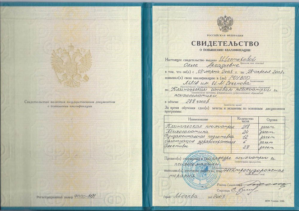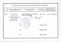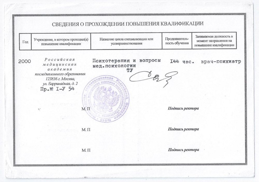 - 2000 г. – «Психотерапия и вопросы мед. Психологии» Российская медицинская академия последипломного образования.