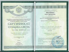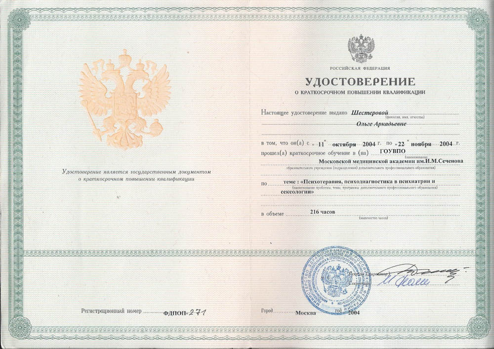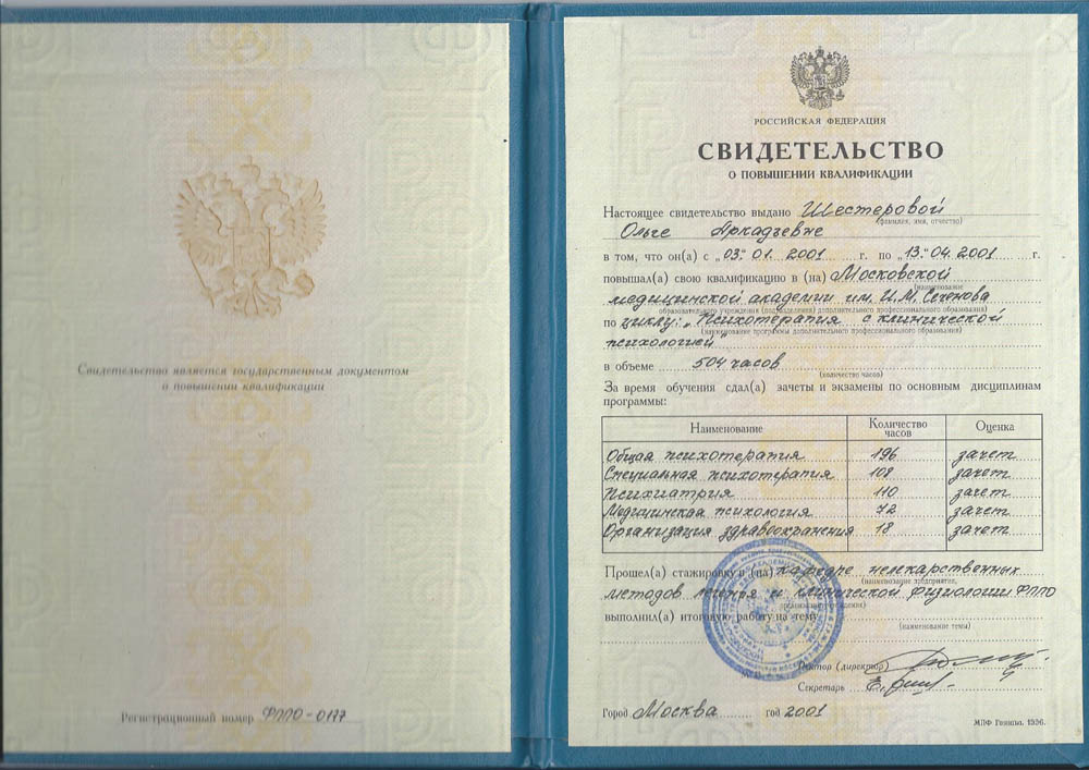 - 2001 г. – «Психотерапия с клинической психологией» ММА им. И.М. Сеченова