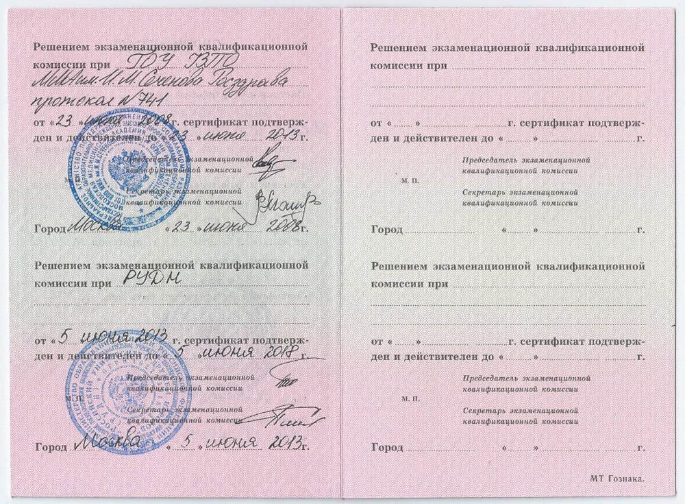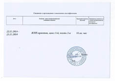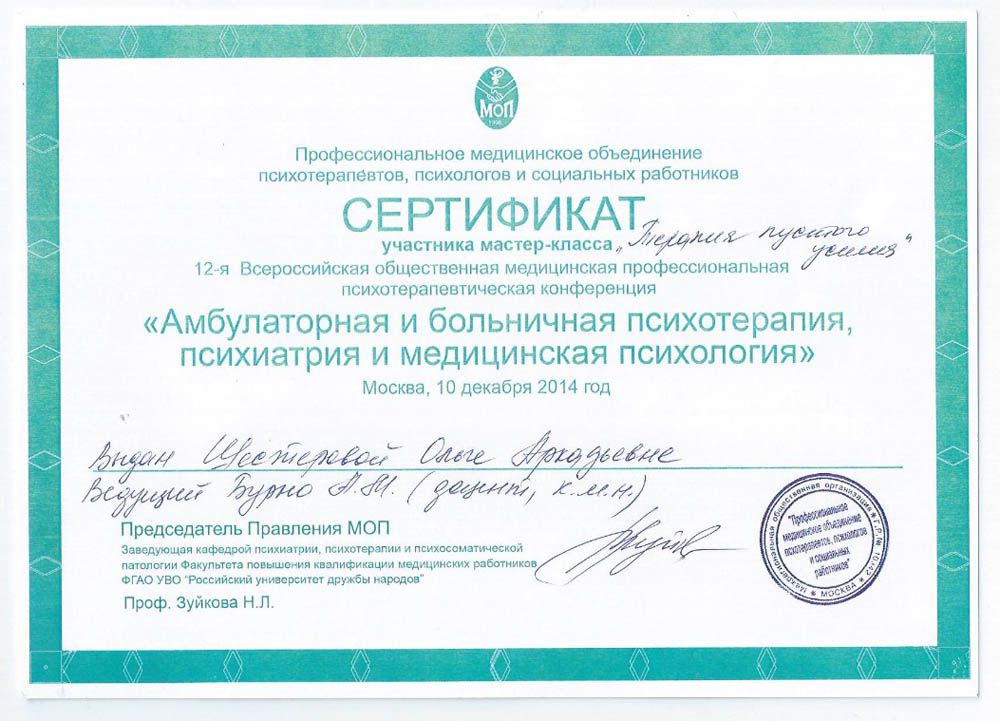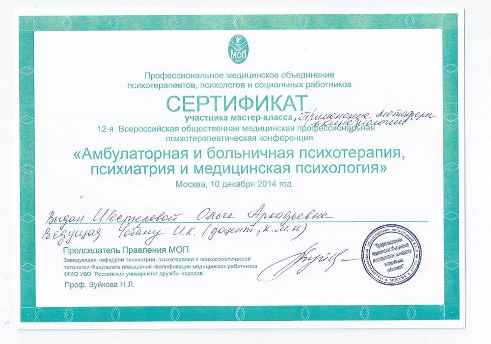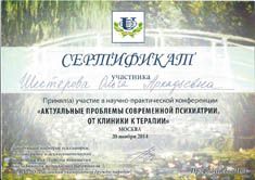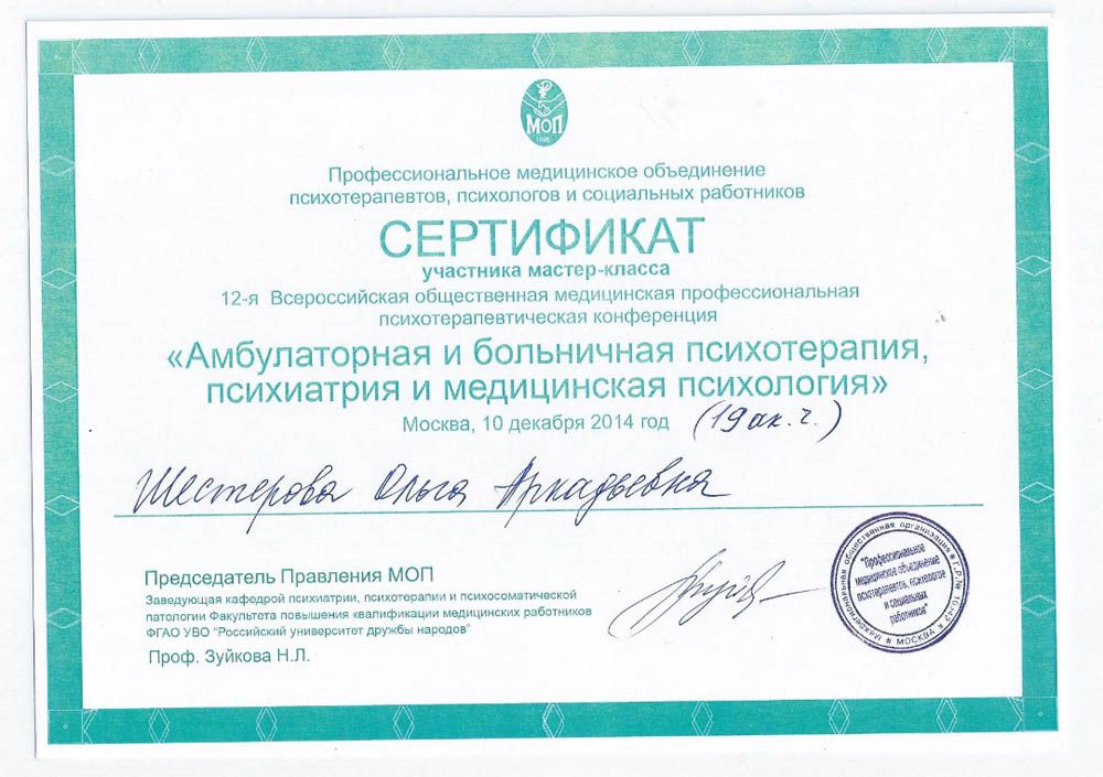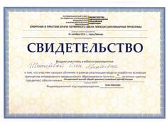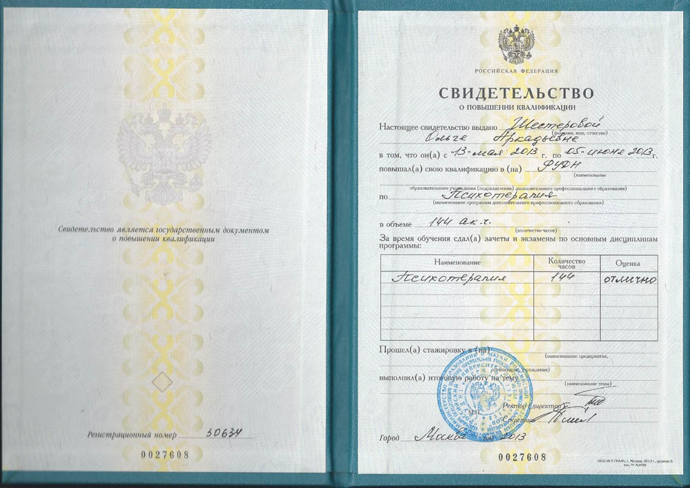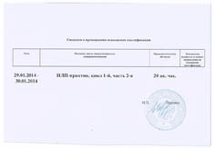 - 2013 г.- Повышение квалификации по специальности «Психотерапия».