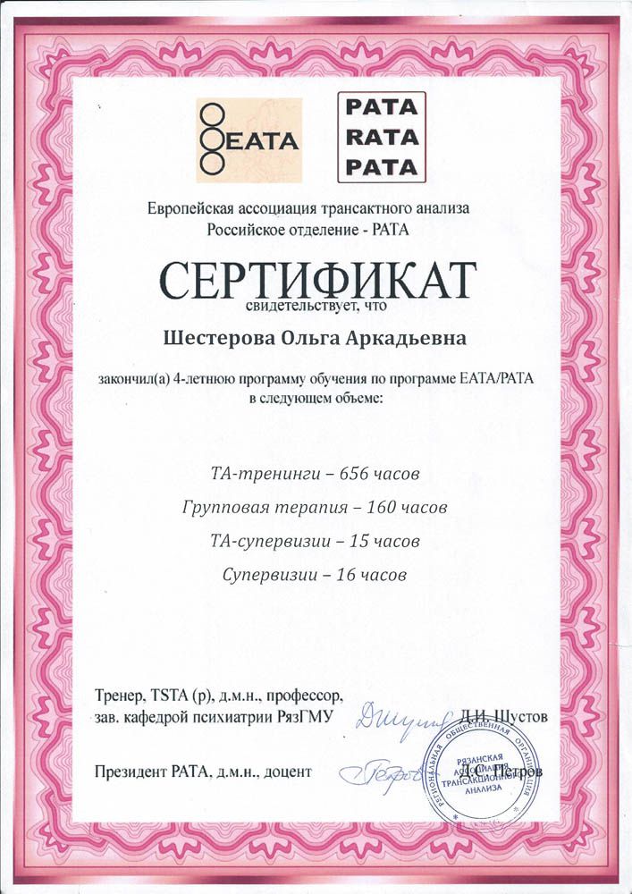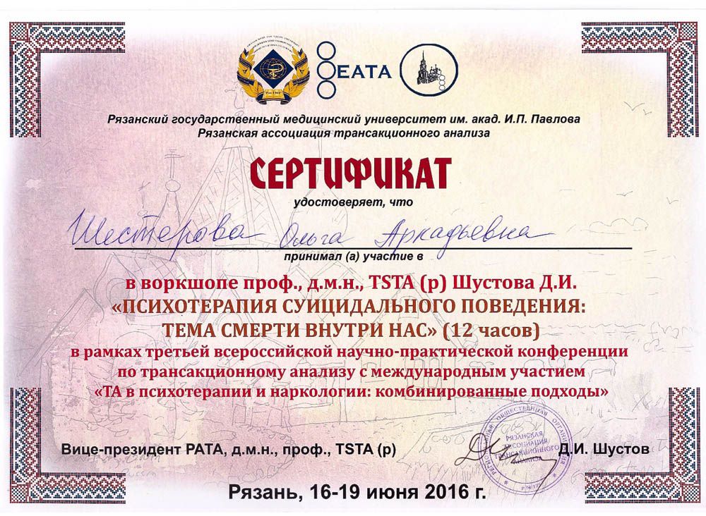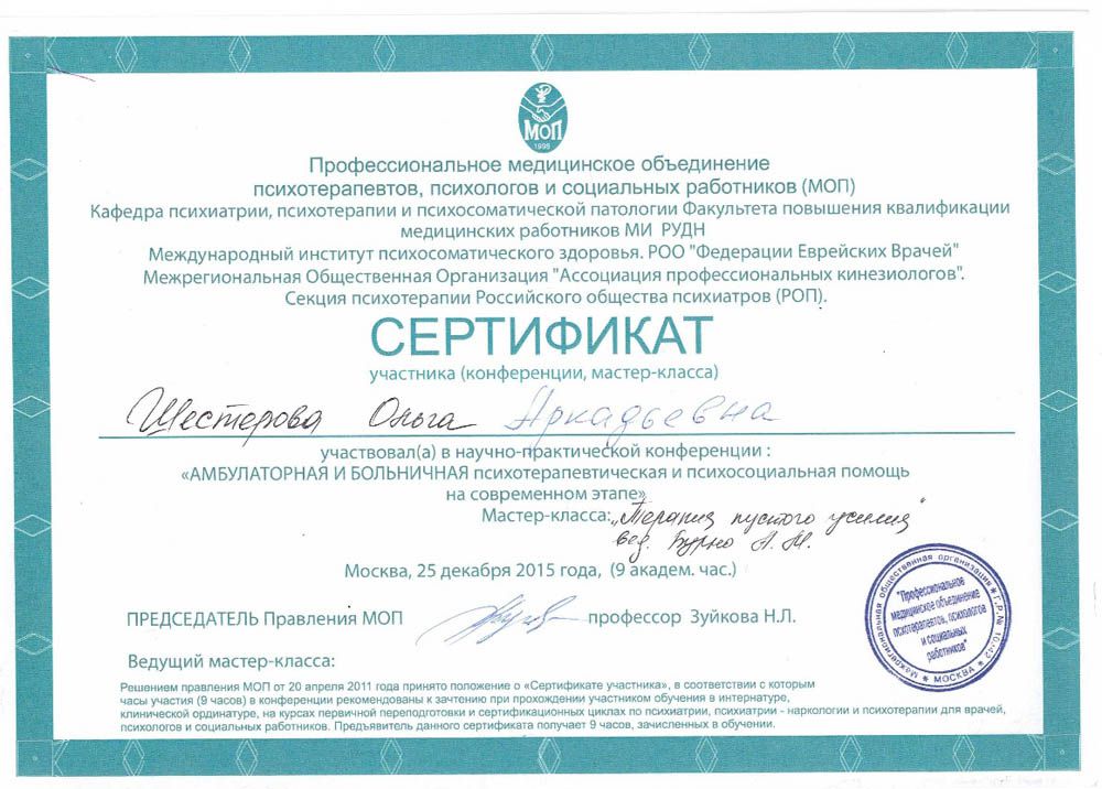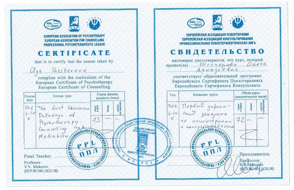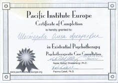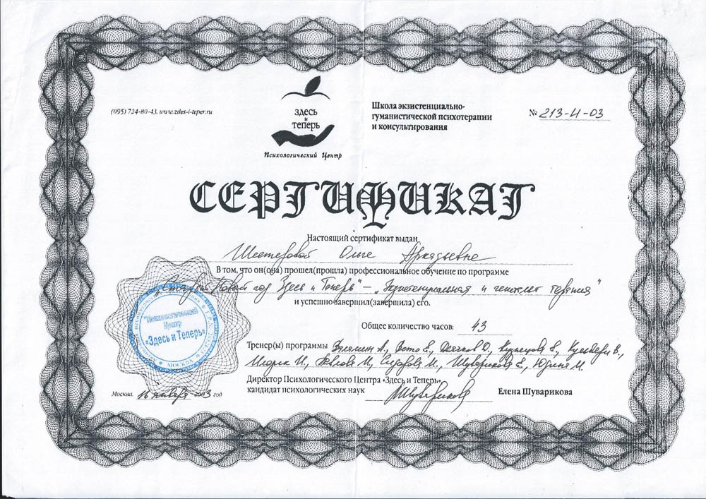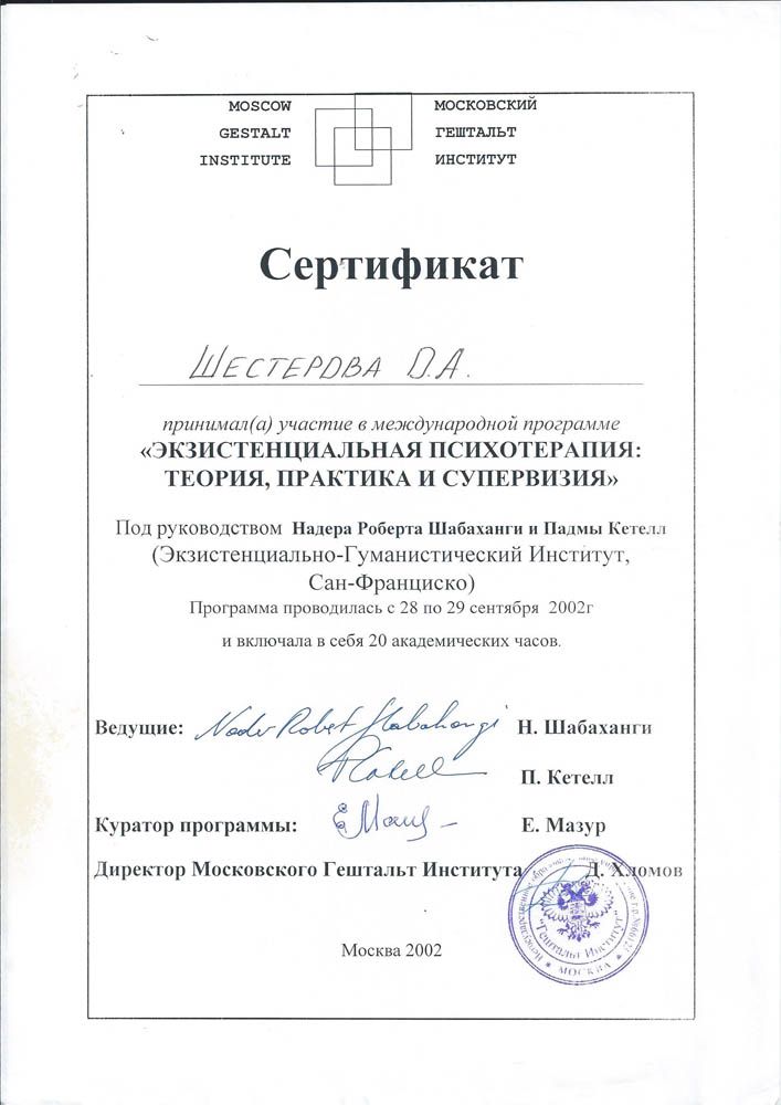 - 2002г.- Московский гештальт институт. «Экзистенциальная психотерапия: теория, практика и супервизия».