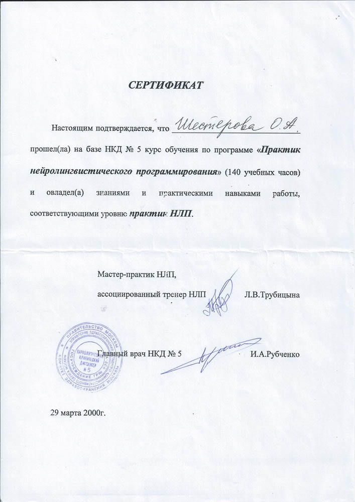 - 2000 г.- «Практик нейролингвистического программирования». НКД№5 Правительства Москвы.