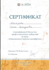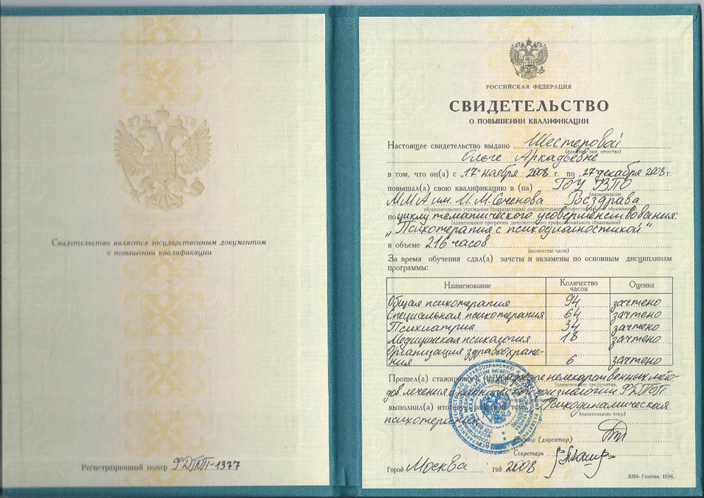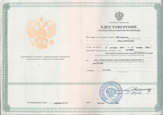 - 2001 г. – «Психотерапия, психодиагностика в психотерапии» ГОУВПО ММА им. И.М. Сеченова.