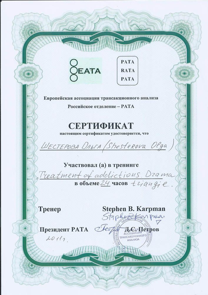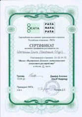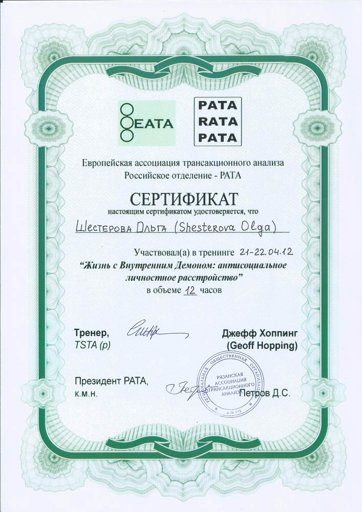- 2012 г.- Участвовала в тренинге «Терапия зависимостей». Европейская ассоциация трансакционного анализа. Российское отделение РАТА.