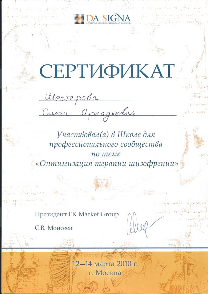 - 2010 г.- Школа профессионального сообщества по теме «Оптимизация терапии шизофрении».
