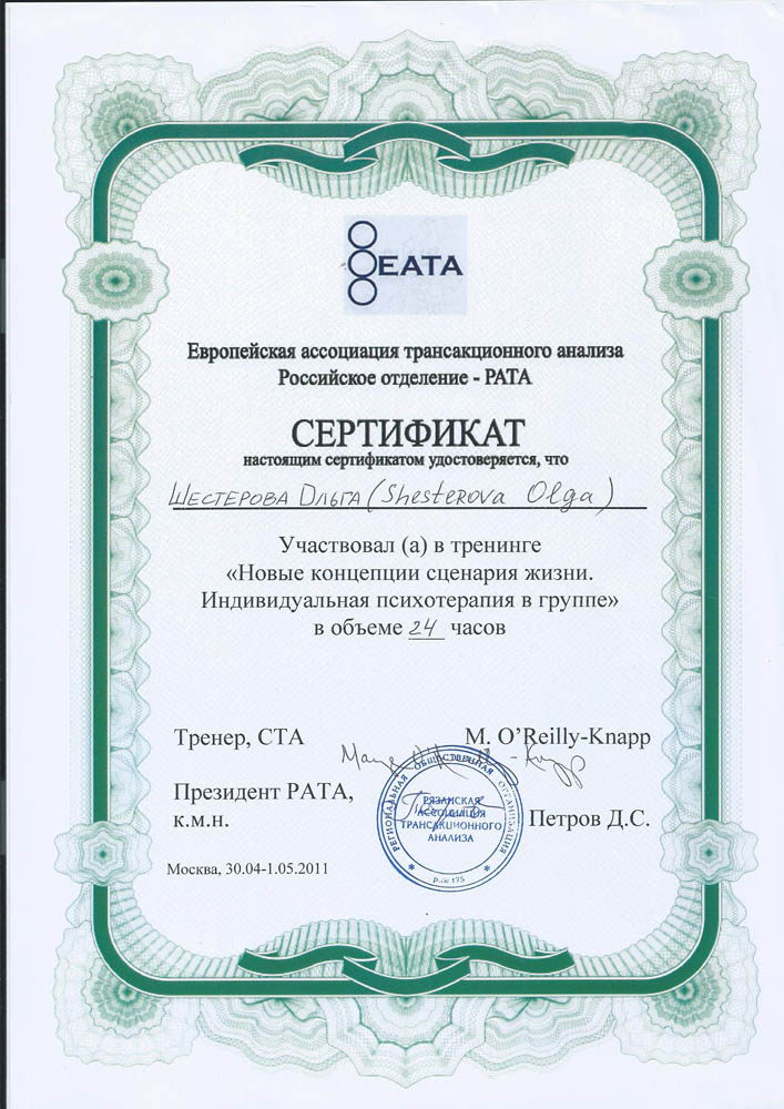 - 2011 г.- Участвовала в тренинге «Новые концепции сценария жизни. Индивидуальная психотерапия в группе». Европейская ассоциация трансакционного анализа. Российское отделение РАТА.