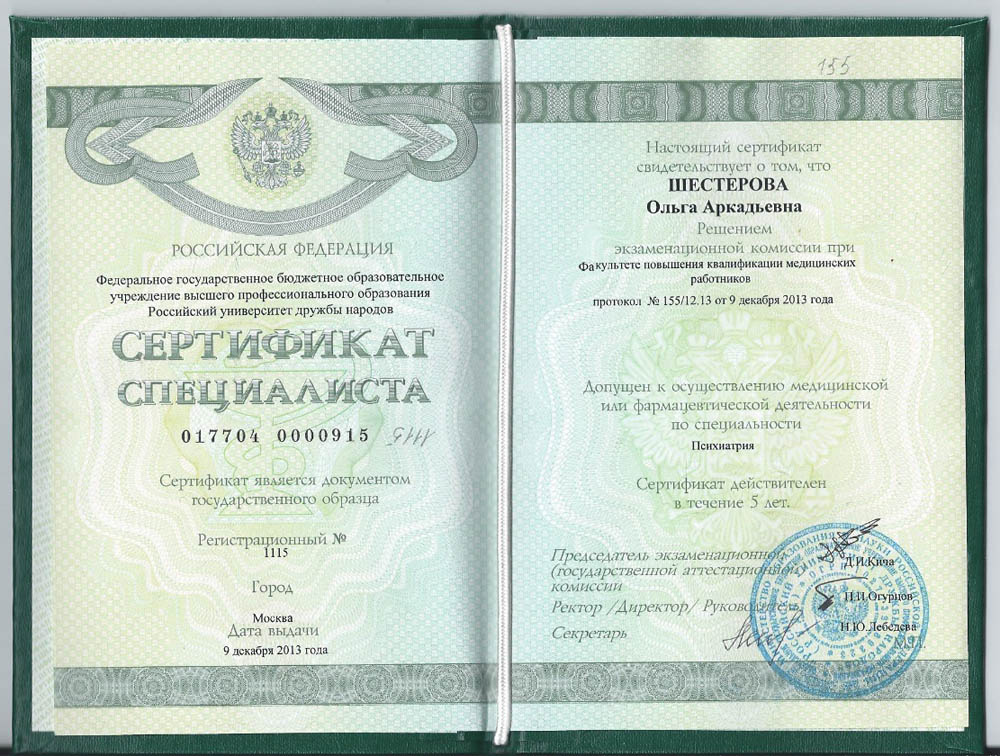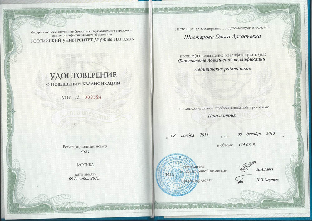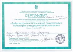 - 2013 г.- Повышение квалификации по специальности «Психиатрия».