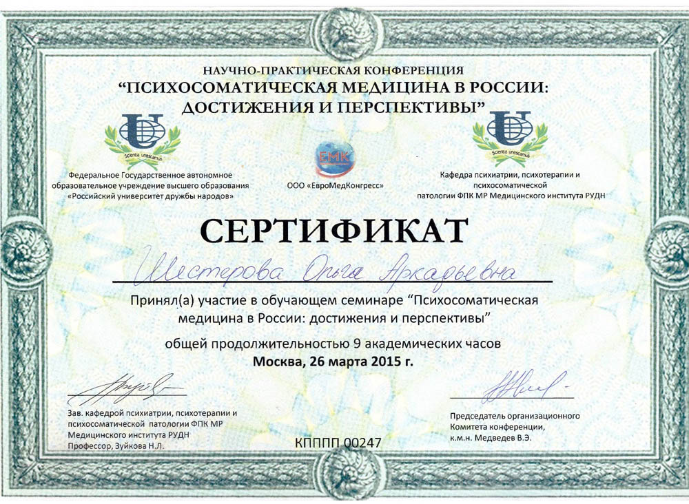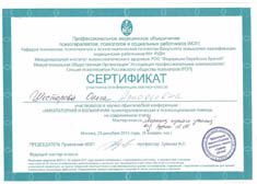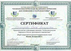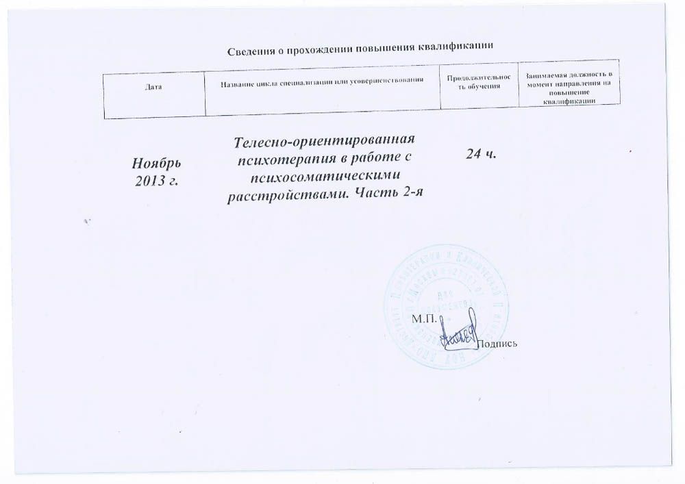 - 2013 г.- Телесно - ориентированная психотерапия в работе с психосоматическими расстройствами. Институт психотерапии и практической психологии.