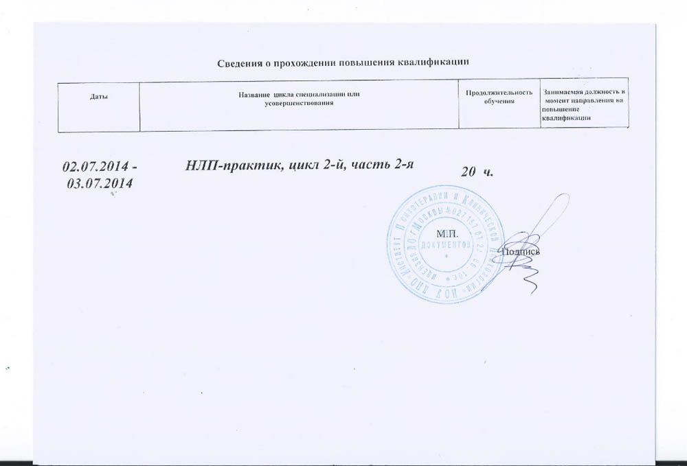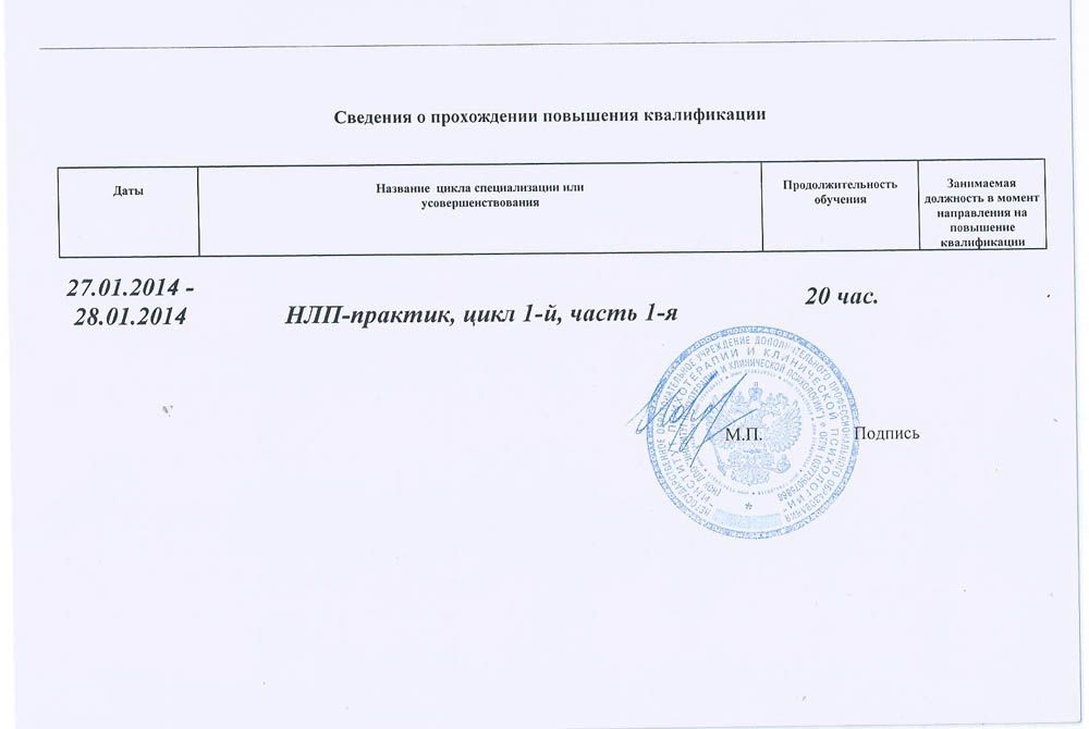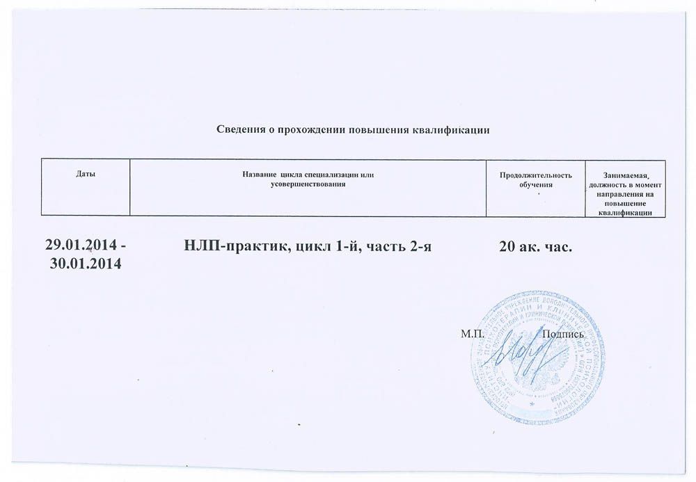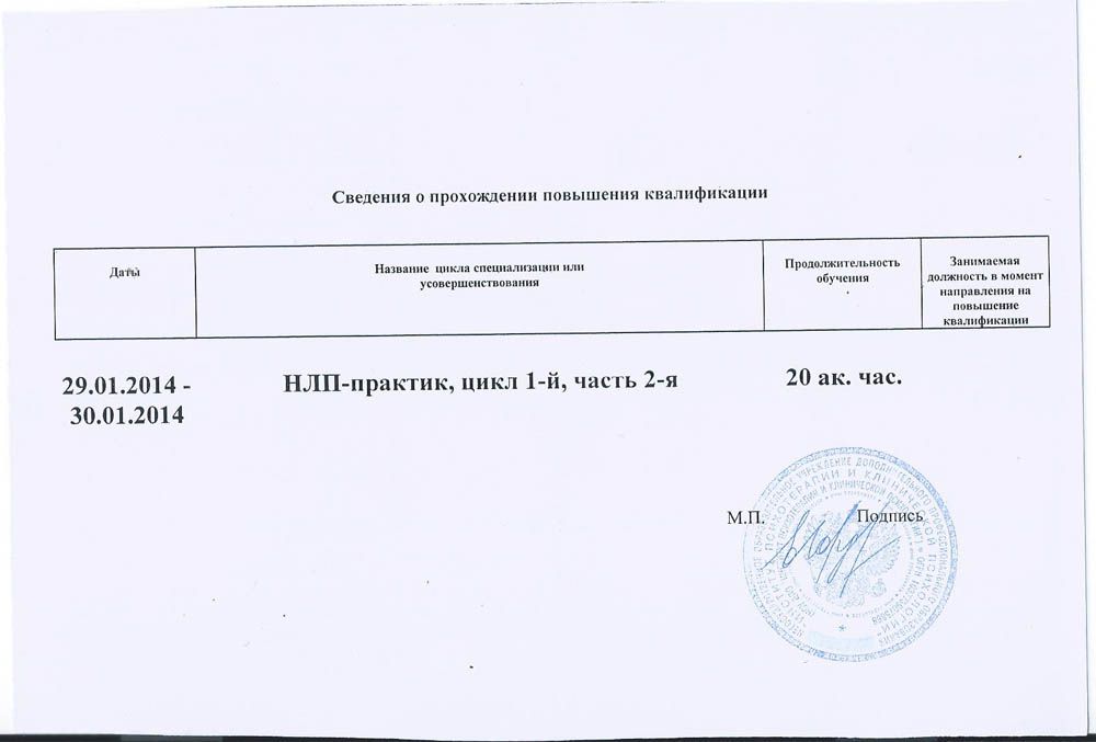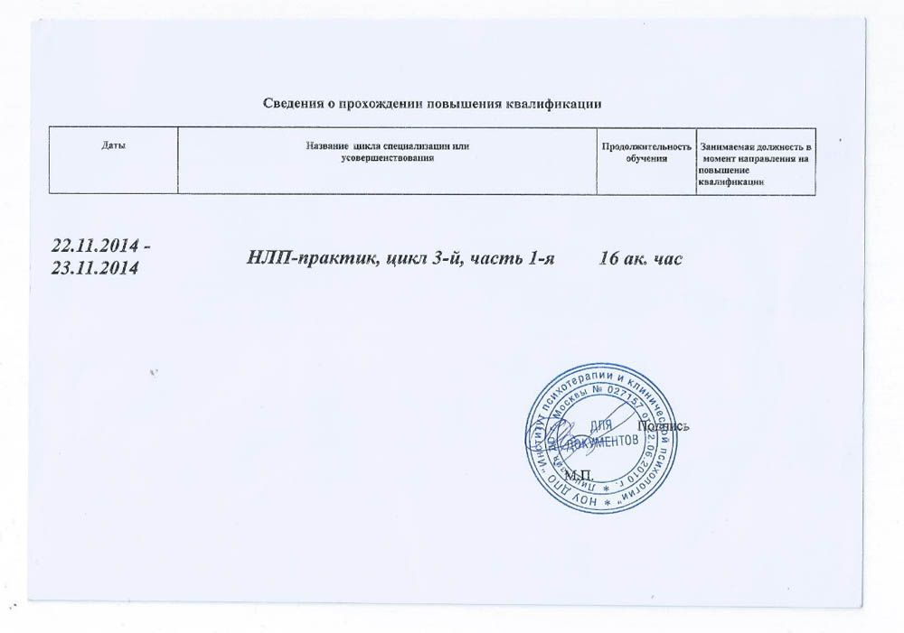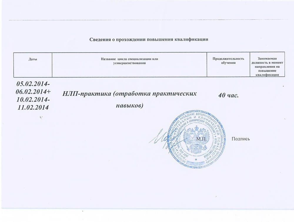 - 2014 г.- НЛП практик. Институт психотерапии и практической психологии.