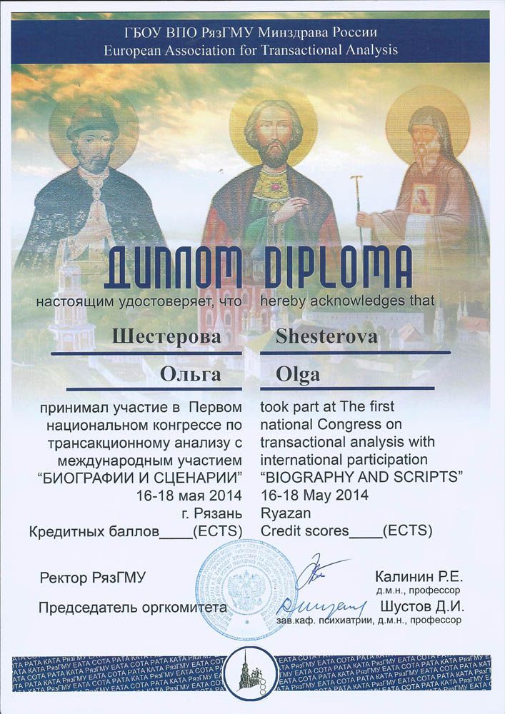 - 2014 г.- Участник Первого национального конгресса по трансакционному анализу с международным участием «Биографии и сценарии». Рязань.