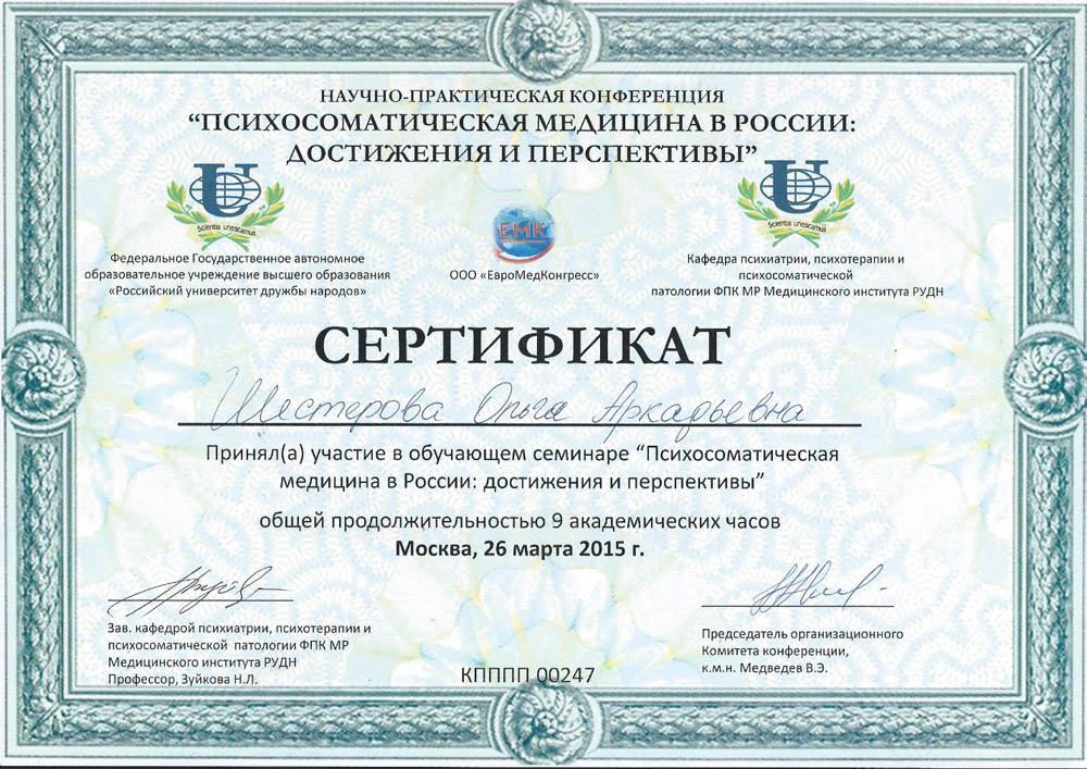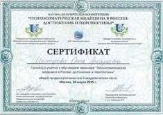 - 2015 г- Участие в обучающем семинаре «Психосоматическая медицина в России: достижения и перспективы».