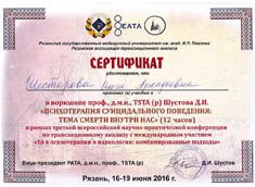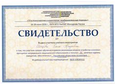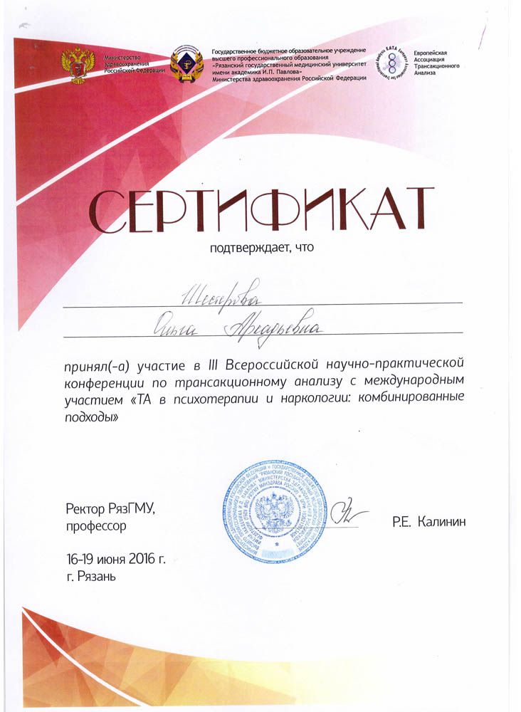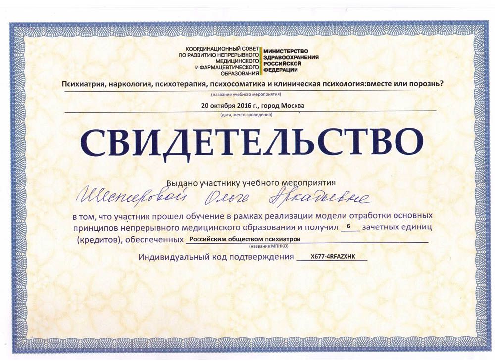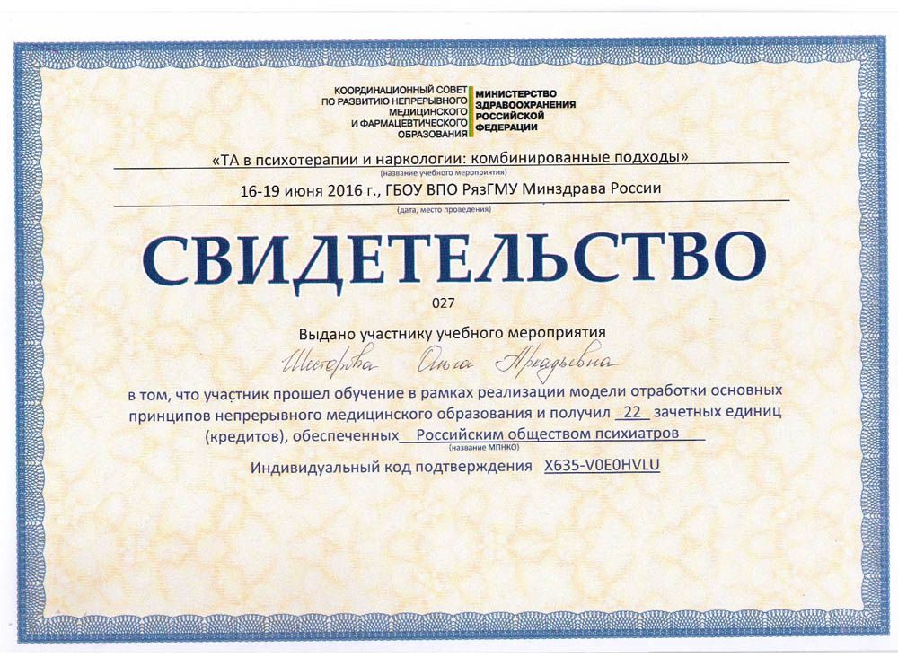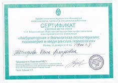 - 2016 г.- Участник учебного мероприятия «Психиатрия, наркология, психотерапия, психосоматика и клиническая психология: вместе или порознь»