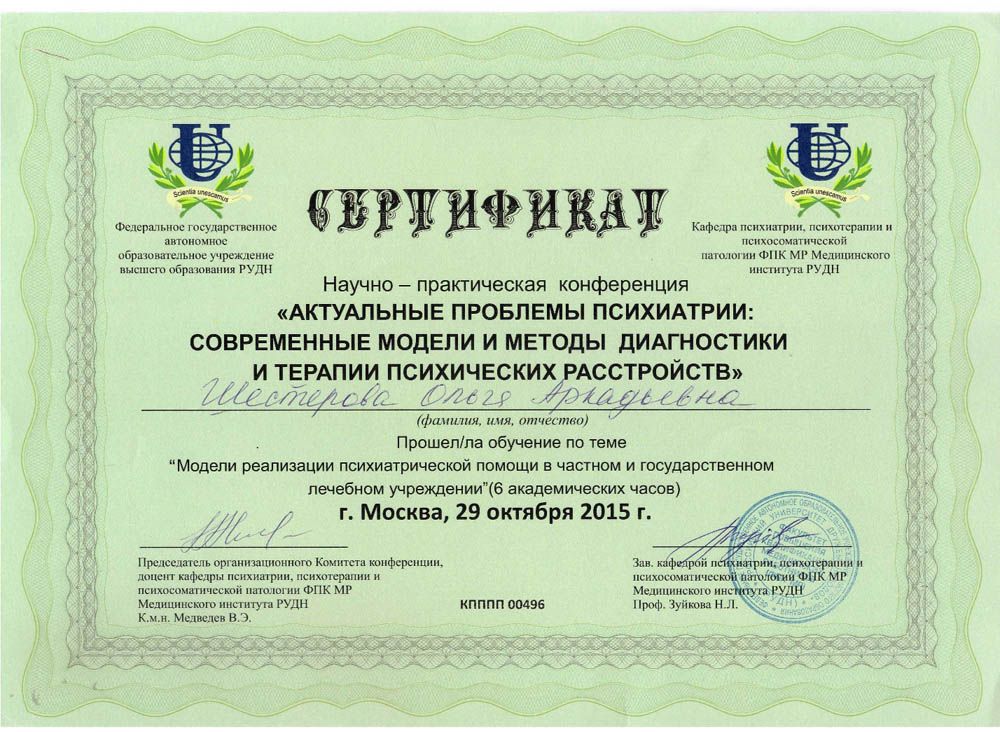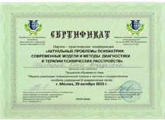 - 2015 г- Обучение по теме «Модели реализации психиатрической помощи в частном и государственном лечебном учреждении». Участник конференции «Актуальные проблемы психиатрии: современные модели и методы диагностики и терапии психических расстройств».