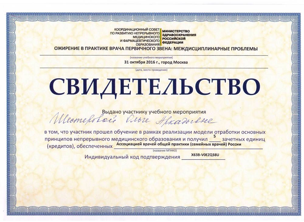 - 2016 г- Участник учебного мероприятия «Ожирение в практике врача первичного звена: междисциплинарные проблемы».