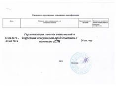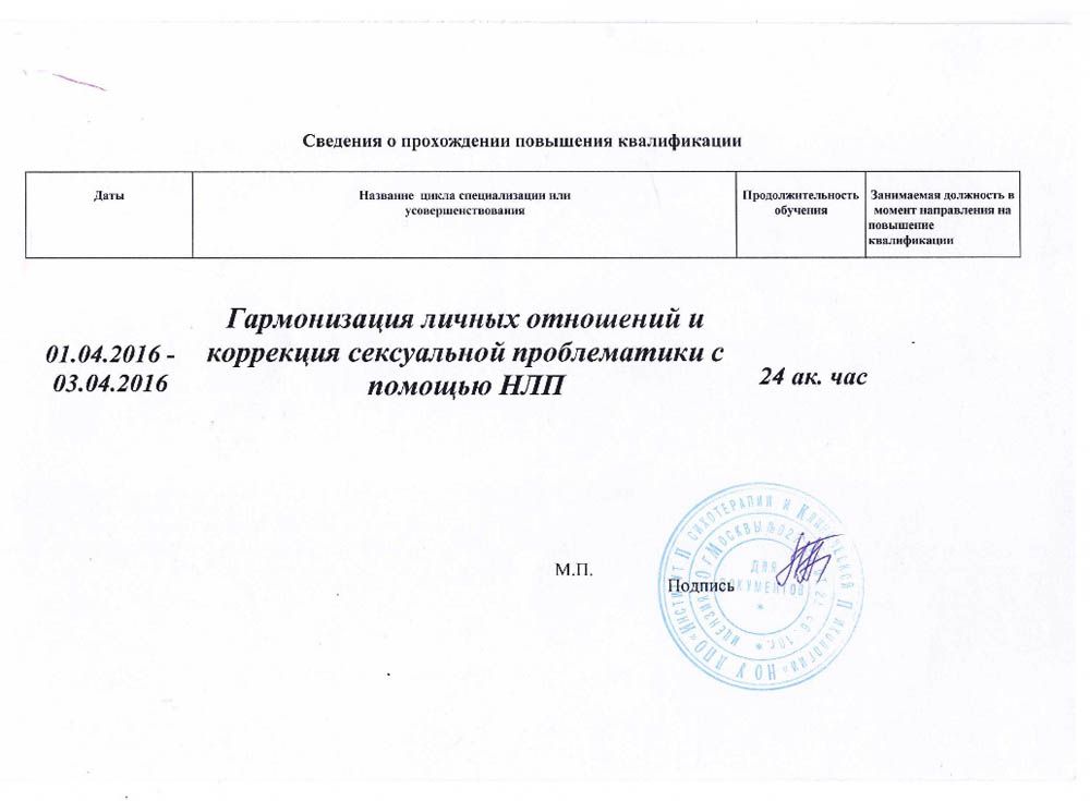 - 2016 г.-Гармонизация личных отношений и коррекция сексуальной проблематики с помощью НЛП. Институт психотерапии и клинической психологии.