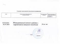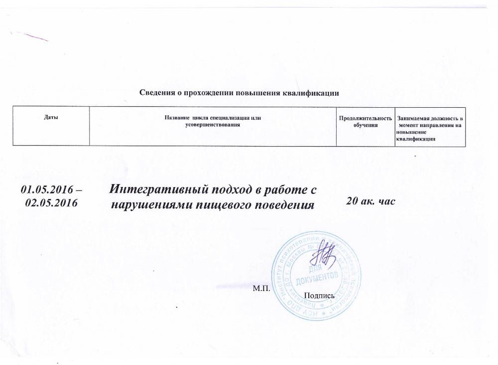 - 2016 г.- Интегративный подход в работе с нарушениями пищевого поведения. Институт психотерапии и клинической психологии.