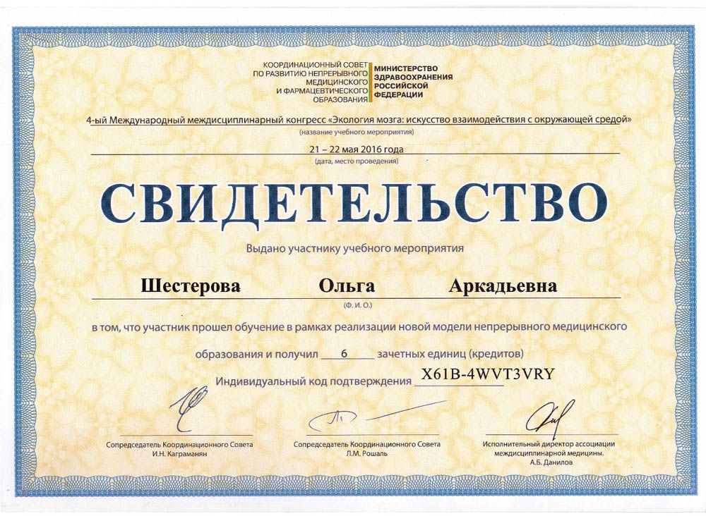 - 2016 г.- Участник учебного мероприятия :4-ый Международный междисциплинарный конгресс «Экология мозга: искусство взаимодействия с окружающей средой».